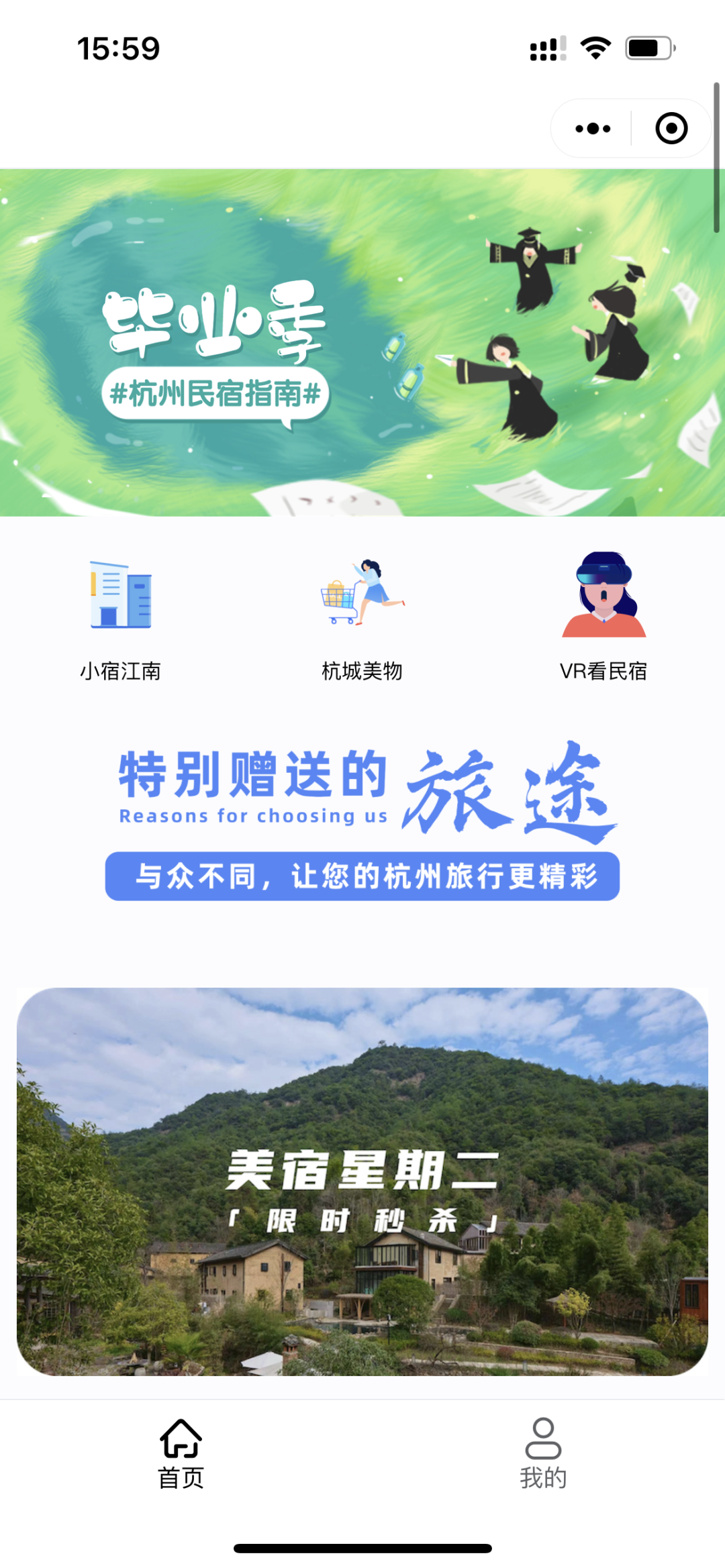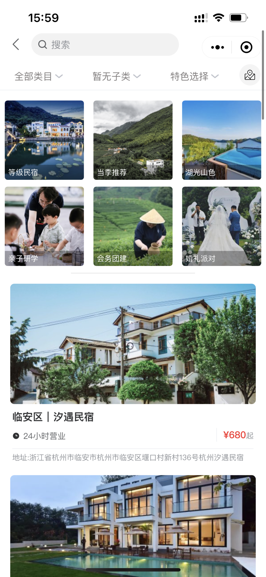 小程序围绕江南小宿、杭城好物、VR看民宿三位一体,充分地展现了民宿风采,优质地方特产等,平台从民宿特色场景进行分类推荐,诸如会务团建、婚礼派对、亲子研学等等。