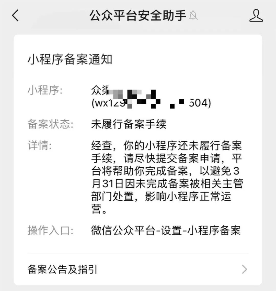 据悉,自2023年9月1日起,若微信小程序未上架,微信小程序需完成备案后才可上架;若微信小程序已上架,则需在2024年3月31日前完成备案,逾期未完成备案,平台将按照备案相关规定于2024年4月1日起进行清退处理。